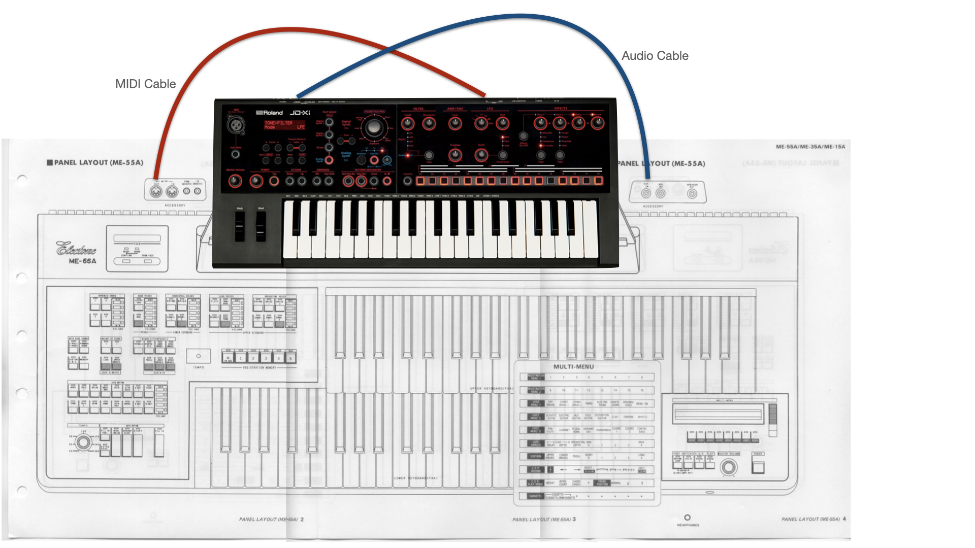 The organ I have is a Yamaha Electone ME-55a, but many others will work, as will other synthesisers, almost certainly the JD-Xa, but others with multiple synthesiser channels may work with this same trick.